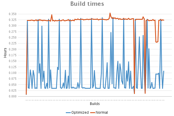 Clover's test optimization was configured to perform full test run every 10 builds. This is a reason why you can see regular peaks in optimized build time. |