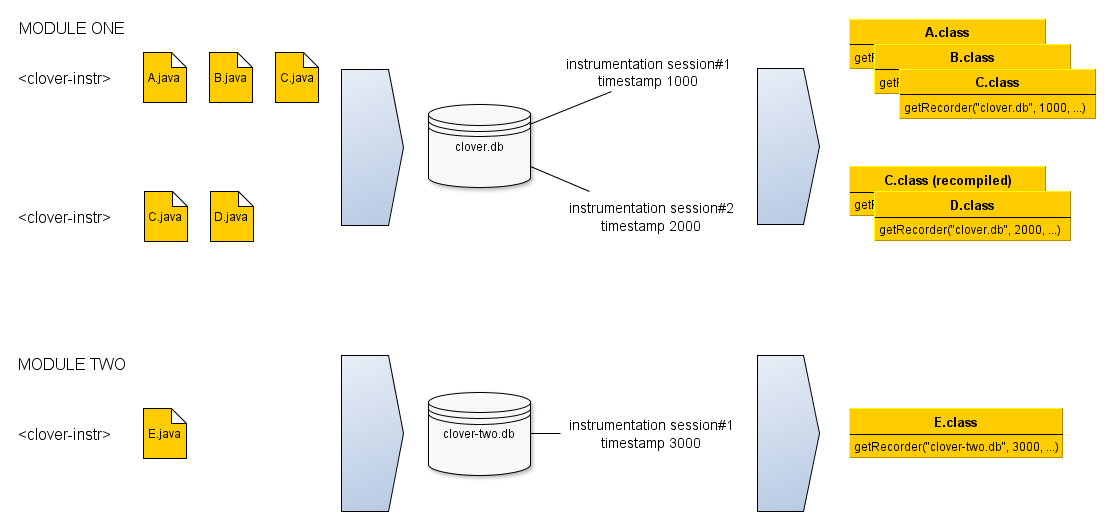 Every time Clover instruments the code (via <clover-instr/> or <clover-setup/> - both Java and Groovy) it records information about the code structure (packages, files, classes, method, statements, branches, test methods etc) into the Clover database. Because of fact that the same database can be used multiple times (for instance in case of incremental compilation; or when project has several modules compiled separately), it maintains history of changes in blocks named 'instrumentation session'.
