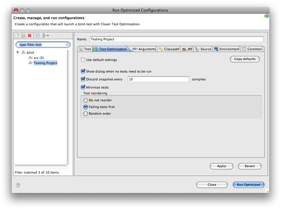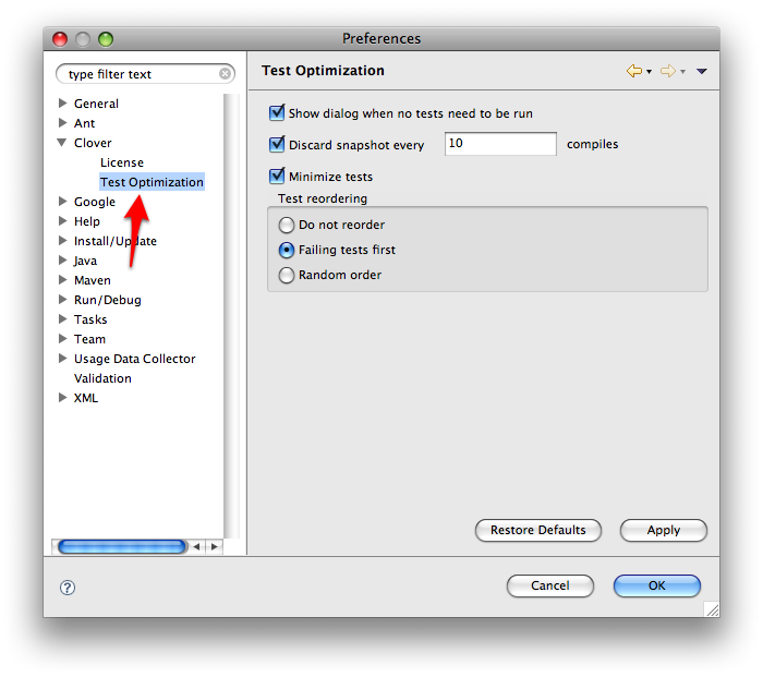 This page explains how to set up Clover's Test Optimization feature in the Eclipse development environment.