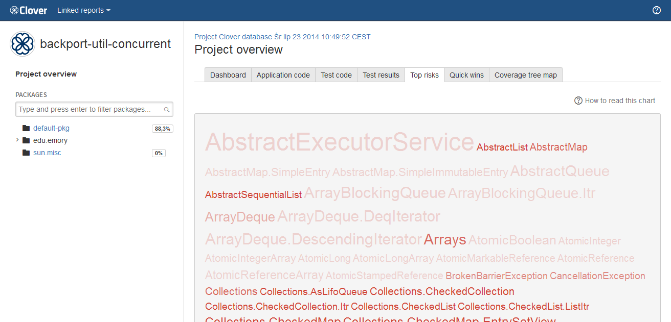 This Cloud highlights the "low hanging coverage fruit" of your project or package. You will achieve the greatest increase in overall project coverage by covering the largest, reddest classes first. Package Quick Win clouds can be toggled to include or exclude classes in sub-packages.