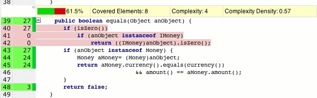 One method in the Money library that is not fully covered is the equals() method in the Money class (lines 40-42 as seen below). The first few lines of this method handle the special case when the Money value is zero. The coverage report shows that the code to handle this has not been covered by the tests. Line 40 has been executed 27 times, but since it has never evaluated to true it has not been fully covered and is therefore in red. It follows then that the two successive lines have never been executed.