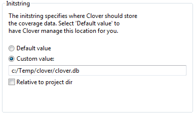 Run Eclipse IDE. Open Project Properties > Clover. Check the "Enable Clover in this project" box. On the "Instrumentation" tab in "Initstring" box:
