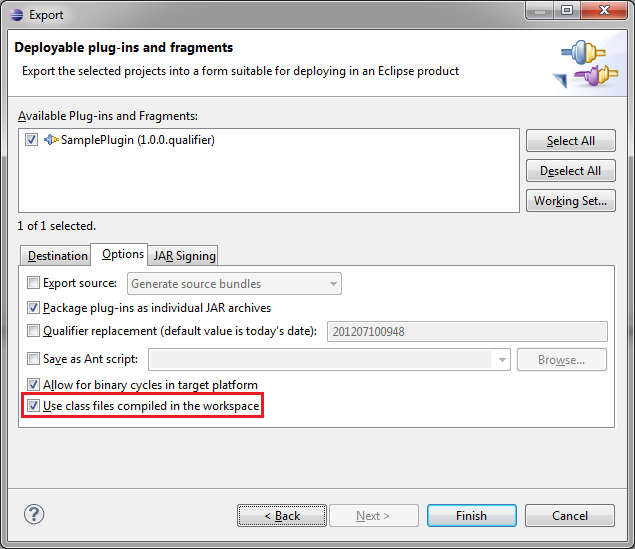 Right click on plug-in project, choose "Export ..." > "Plug-in Development" / "Deployable plug-ins and fragments". On "Options" tab make sure that the "Use class files compiled in the workspace" checkbox is selected.