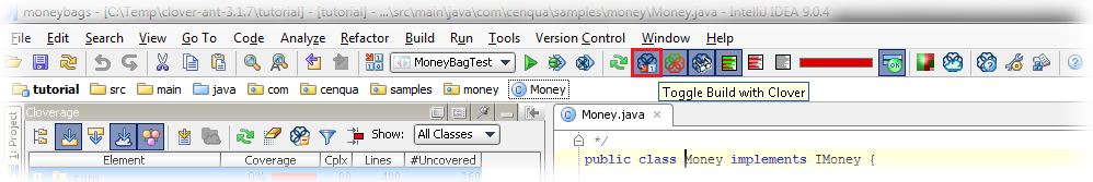 In order to track the code coverage of your projects, Clover must insert special code into your program at compilation time - called instrumentation - to record this coverage. When Clover is enabled on your project, Clover will automatically perform this task for every file you compile in the project. You can tell Clover not to instrument your project by clicking "Toggle build with Clover" button (on a main bar).