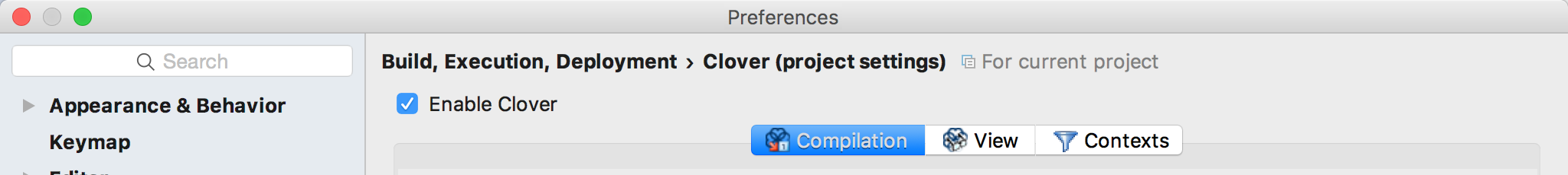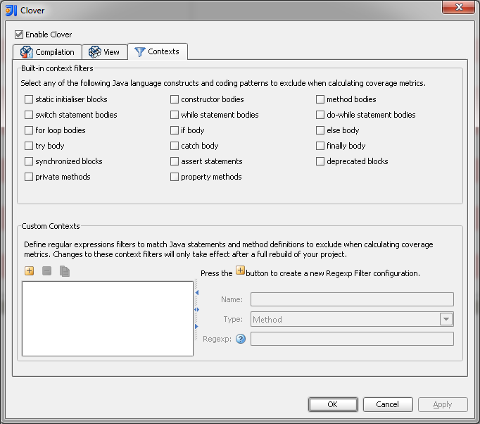 Open "File > Settings > Project Settings > Clover" page. Open "Contexts" tab.